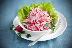 le cherry belle prĂ©coce, avec ses racines Ă©carlates, croquantes et sphĂ©riques, est un choix populaire parmi les cultivateurs. Les radis rouges appartiennent Ă la famille des radis. Les petites sphères rouges sont les genres les plus connues, mais les radis se trouvent en une multitude de formes et de couleurs. Les radis ne doivent pas rester dans le sol pendant plus de 6 semaines, car sinon, ils perdent leur goĂ»t piquant typique et deviennent ligneux. Si la plante fleurit dĂ©jĂ , les radis ne sont plus comestibles en gĂ©nĂ©ral. Les radis doivent ĂŞtre fraĂ®chement rĂ©coltĂ©s, car ce ne sont pas des lĂ©gumes qui peuvent ĂŞtre conservĂ©s. Il est mieux de rĂ©colter les lĂ©gumes-racines, comme le radis, tard l’après-midi. Ceci garantit le meilleur taux de vitamines et la plus faible quantitĂ© de nitrate. VĂ©rifiez la taille des bulbes sur les plantes avec les plus grandes feuilles tous les jours. Les radis sont mĂ»rs avec un diamètre de deux Ă trois centimètres. Vous pouvez ensuite rĂ©colter tous les radis dont les bulbes font cette taille. Les radis sont gĂ©nĂ©ralement mangĂ©s crus dans les salades. Les radis coupĂ©s sont excellents dans les salades de patates, oĂą son croquant passe bien avec les pommes de terres et la mayonnaise froide.